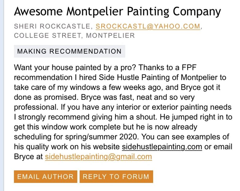 A catchy name, but don't let it fool you. Side Hustle Painting is a residential painting company based in East Montpelier, Vermont. As of 27 years ago, this is not a side business...anymore! As a premier residential painting contractor in Vermont, we are committed to delivering customer service that is second to none in East Montpelier and its surrounding communities., and New England. We offer a wide range of services to meet your residential and light commercial painting needs. Rental refresh jobs, to whole house jobs, big jobs or small, we have you covered. Don't pay for expensive equipment and crews, because we can get the same job done usually for less money in roughly the same amount of time. Plus, we are very educated, respectful, quiet and clean!